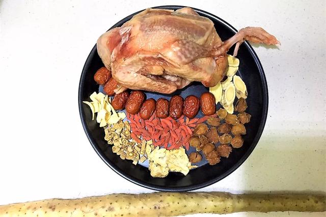 Ingrédients : 1 poulet (environ 500 g), 40 g d'igname chinoise séchée, 20 g de wolfberry, 4 tranches de gingembre Assaisonnement : un peu de vin Shaoxing, sel selon le goût