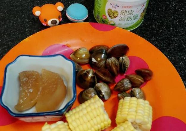 3、Préparez deux petits morceaux de radis, de maïs et de palourdes marinés, assaisonnez de sel uniquement.