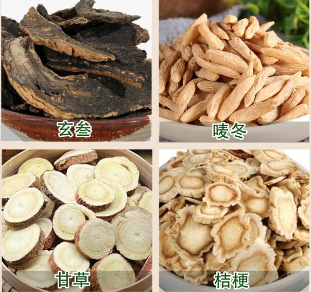 4,5 grammes de Xuan Shen et de Maitong, 3 grammes de Platycodonopsis et 1,5 gramme de réglisse brute. Couper ces quatre ingrédients en petits granulés, les faire infuser dans un thermos d'eau bouillante, laisser mijoter pendant 15 minutes et boire comme un thé.