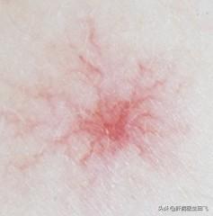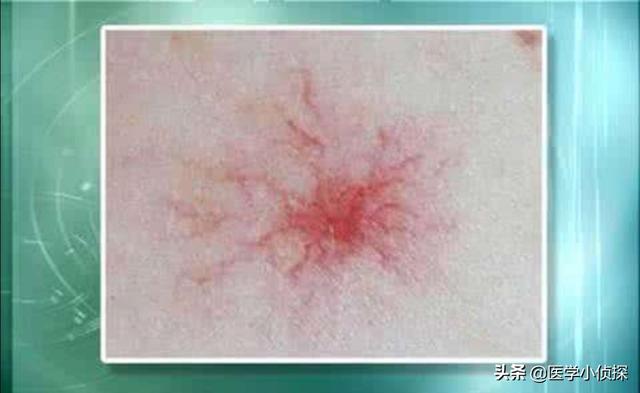 Et ce n'est pas tout.Les grains de beauté comme celui illustré ci-dessous apparaissent sur la partie supérieure du corps, comme le front, le visage, le cou, les épaules et les membres supérieurs.Le naevus en forme d'araignée ressemble à un grain de beauté rouge, mais ce n'est absolument pas un grain de beauté, le centre est légèrement surélevé et la forme ressemble particulièrement à un érythème d'araignée, et l'érythème environnant s'estompe lorsqu'on appuie sur le centre du naevus surélevé. Les causes de ce naevus en forme d'araignée et de la paume du foie sont fondamentalement les mêmes, et elles sont toutes dues à la diminution de la fonction du foie à inactiver les œstrogènes, ce qui entraîne l'accumulation d'œstrogènes et l'expansion des vaisseaux sanguins périphériques dans l'organisme.