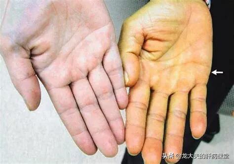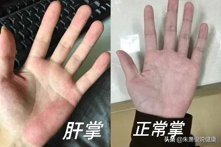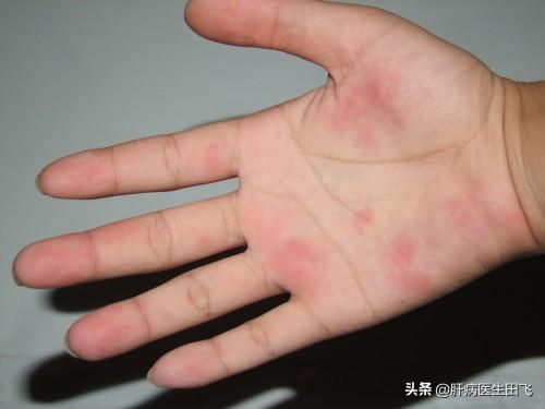 2. les manifestations des palmiers à foie :Les paumes des mains sont larges, avec des squames de congestion entre les petits poissons, ou des taches rouges, des plaques, qui blanchissent quand on les presse ;
