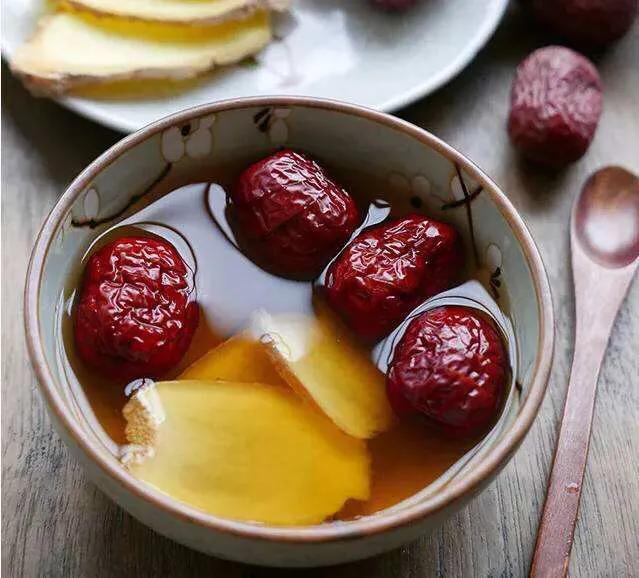 25-30 g de jujube, 10 g de gingembre, 0,5-1,5 g de thé noir. Faire bouillir le jujube avec de l'eau et le sécher. Faire frire les tranches de gingembre à sec, ajouter le miel et faire frire jusqu'à ce qu'il devienne légèrement jaune. Ensuite, le jujube, le gingembre et les feuilles de thé noir sont plongés dans l'eau bouillante pendant 5 minutes. Prendre 1 dose par jour, répartie en 3 fois de dattes diététiques chaudes. Le gingembre pour chasser le froid, les dattes rouges pour reconstituer le sang, le gingembre et les dattes pour renforcer la rate et l'estomac, l'effet curatif est très bon, applicable au corps froid, à la rate faible.