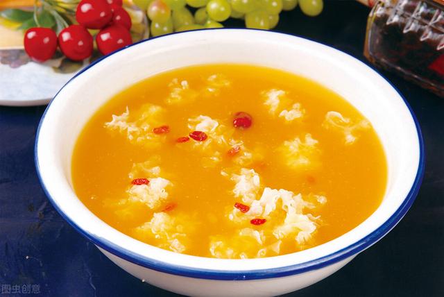 Méthode : ①Éplucher, reformer et enlever les graines du potiron. ② Les tranches de potiron sont cuites à la vapeur pendant 15 minutes, enlevées, pressées en purée. ③ Verser l'oreille argentée bouillie dans le mélange, un bol de soupe au potiron et à l'oreille argentée est prêt.