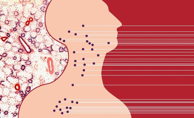 Lorsqu'il se dirige vers la thyroïde, il forme un nodule thyroïdien ; lorsqu'il reste dans le sein, il s'agit d'une hypertrophie mammaire.