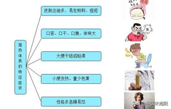 La constitution de chaleur humide se caractérise par une transpiration excessive et la peur de la chaleur, un corps lourd et endormi, la confusion, le flegme et une gorge défavorable, des sécrétions jaunâtres, telles que des mucosités nasales jaunâtres, des gouttes oculaires et de la salive jaunâtres, des urines courtes et jaunâtres, et des leucorrhées jaunâtres. Elle s'accompagne également de symptômes sous-jacents de stagnation de l'humidité. Sur le plan clinique, le corps froid et humide est plus susceptible de se manifester dans les maladies chroniques du système digestif, l'hypothyroïdie et les tumeurs. La constitution humide-chaude se rencontre surtout dans les cas de gastrite chronique, de névrose, de goutte, d'hyperlipidémie, etc.
