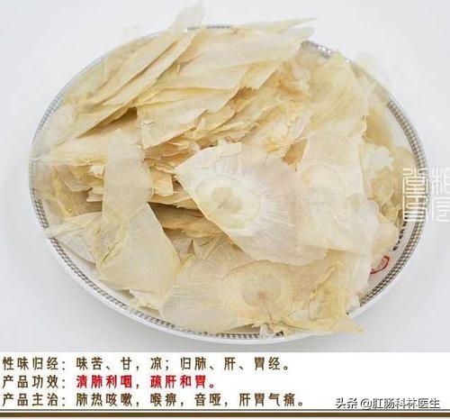 Le Dictionnaire de la médecine traditionnelle chinoise indique qu'il "dégage la chaleur des poumons et est bénéfique pour la gorge. Il est utilisé pour traiter les bronchites aiguës et chroniques, les maux de gorge et les amygdalites. La pharmacopée chinoise indique qu'il "dégage les poumons, provoque des maux de gorge, dissipe le foie et harmonise l'estomac, et qu'il est utilisé en cas de toux due à la chaleur des poumons et de douleurs au foie et à l'estomac".