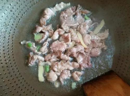 3. Sur la photo suivante, ajouter la bonne quantité d'huile dans la poêle, lorsque l'huile est chaude, verser le porc mariné et le faire sauter.