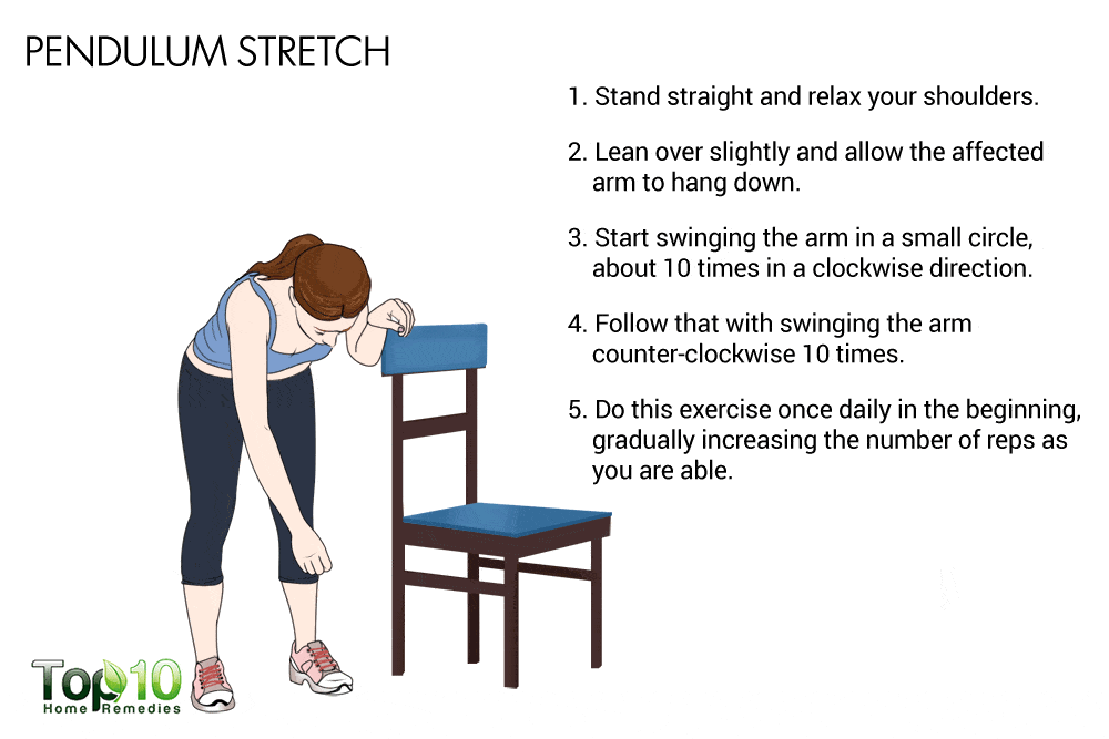 Le patient se tient debout, le corps fléchi vers l'avant, le membre affecté complètement détendu, et la gravité du membre supérieur est utilisée pour simuler un pendule se balançant d'avant en arrière ou d'un côté à l'autre dans une fourchette indolore. Si le patient le tolère, des poids supplémentaires peuvent être tenus dans les mains.