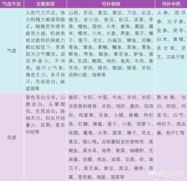 Les insuffisances de qi et de sang doivent être rapidement corrigées par le régime alimentaire. Tout d'abord, il convient de boire de la soupe de poulet pour reconstituer le qi, ou de décocter de l'eau avec du codonopsis et de l'astragale pour reconstituer le qi. Les personnes souffrant d'une carence en qi peuvent se référer au tableau suivant pour la régulation du régime alimentaire.