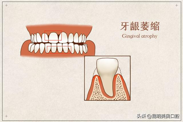 - La parodontite.L'un des changements pathologiques de la parodontite est la résorption de l'os alvéolaire. La résorption de l'os alvéolaire et la diminution du niveau d'attachement parodontal entraînent une diminution de la hauteur du tissu gingival. En outre, la parodontite est traitée pour éliminer l'inflammation, ou certaines des poches parodontales sont éliminées au moyen d'une chirurgie parodontale, ce qui entraîne également un recul des gencives et l'exposition des racines des dents.