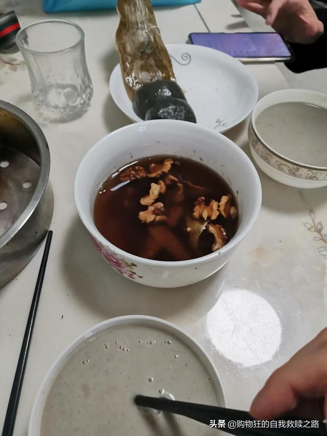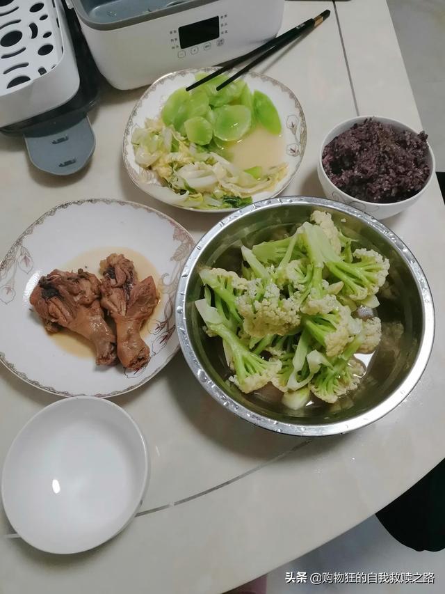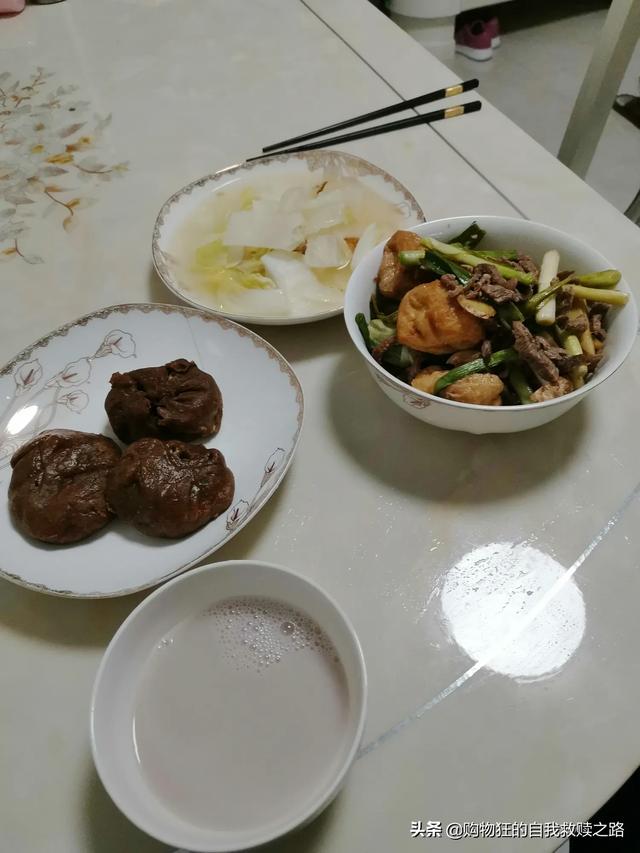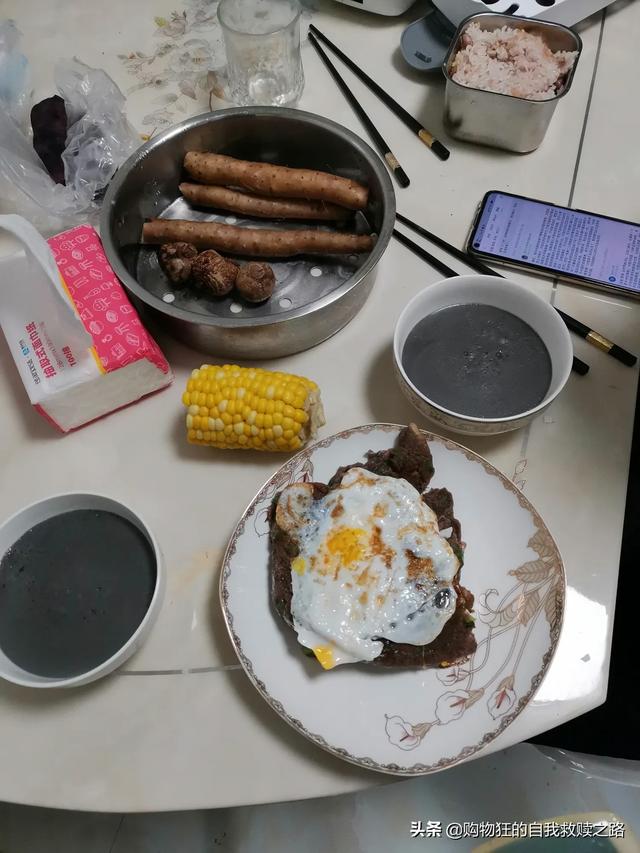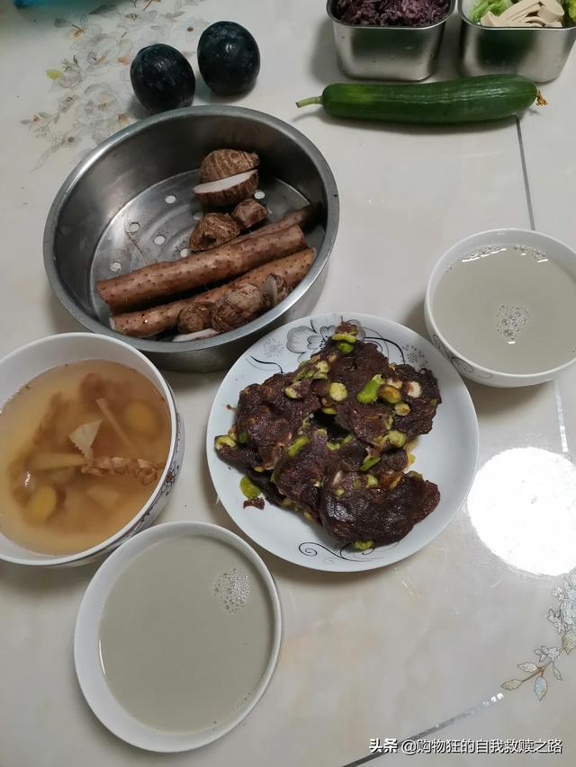 Regardez les repas pour deux personnes. Petit-déjeuner un lait de soja noir (vous pouvez ajouter ce que vous voulez comme des haricots noirs, des haricots rouges adzuki, des haricots rouges, des lentilles rouges turques, des cacahuètes, des graines de sésame, des noix, de l'orge, 。。。。。。). Un œuf. Une petite portion d'aliment de base (pain complet, omelette, nouilles de sarrasin, riz konjac, maïs, igname, taro). Une portion de gélatine de poisson pour les protéines.