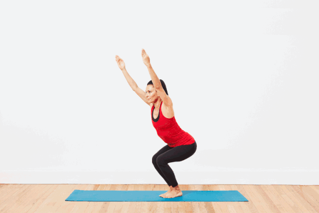 3) Expirez, pliez les jambes et asseyez-vous en baissant les hanches.(sensation de s'asseoir sur une chaise)