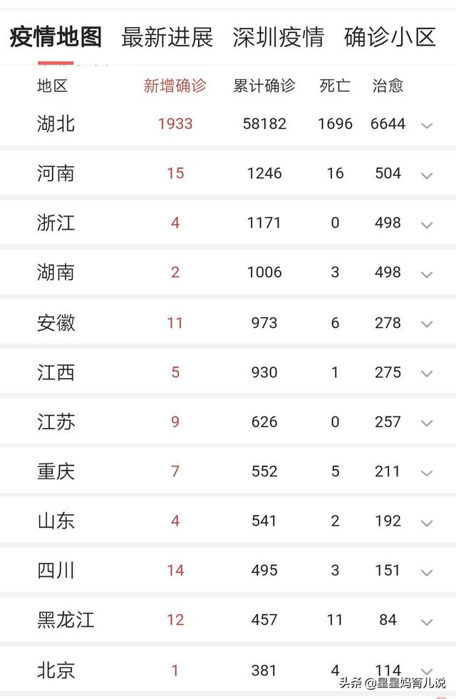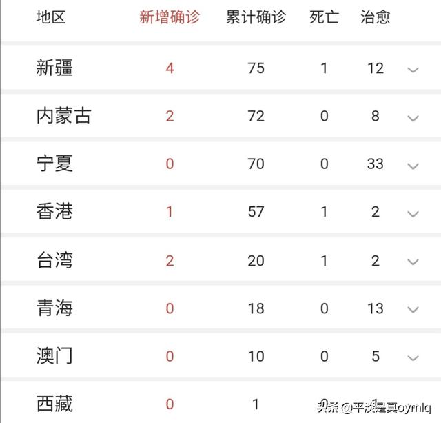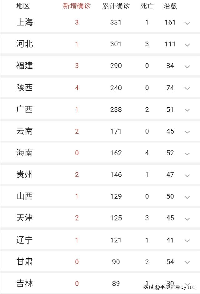 Guangdong, Zhejiang, Hunan, Jiangxi, Jiangsu, Chongqing, Shandong, Pékin, Shanghai, Hebei, Fujian, Shaanxi, Guangxi, Yunnan, Guizhou, Shanxi, Tianjin, Liaoning, Mongolie intérieure, Xinjiang, au total 21 provinces et municipalités n'ont que quelques nouveaux cas confirmés, dont cinq provinces et municipalités n'ont qu'un seul nouveau cas confirmé.