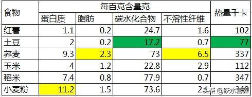 La comparaison des données sur les principaux nutriments de plusieurs aliments pouvant être utilisés comme aliments de base dans le tableau ci-dessus montre qu'à poids égal, les patates douces ne représentent que les deux septièmes de la farine de blé en termes de calories et un dixième de la farine de blé en termes de protéines.