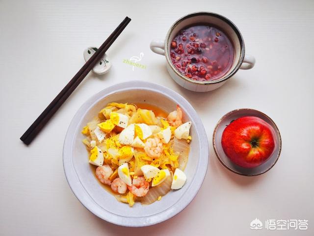 Dîner : 250 g de bouillie de céréales mélangées + 100 g de pomme + œuf au chou et aux crevettes, 320 kcal, avec un équilibre entre les trois principaux nutriments.