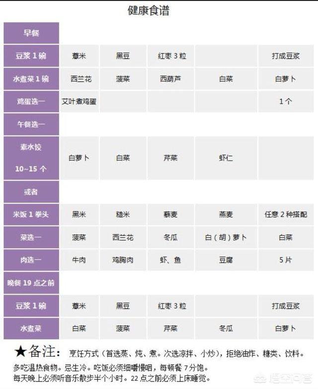 Tout d'abord, le petit-déjeuner.Remplacer le porridge de nouilles de riz blanc par du riz noir, du sésame noir, des haricots noirs, du jus de viande, du millet, des haricots rouges, des graines de lotus, du muguet, chaque fois que vous choisissez cinq types de combinaisons libres, un bol de porridge le matin, un œuf ou trois tranches de bœuf, et la taille de deux paumes de main combinées ensemble avec une portion d'au moins trois couleurs de légumes. (Méthode de cuisson, choisir la cuisson à l'étouffée, l'ébullition, l'assaisonnement) assaisonnement au choix.