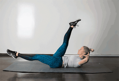 Allongez-vous sur le dos, les jambes jointes et levez-les. Levez les mains et décollez les épaules du sol, en touchant les orteils autant que possible.