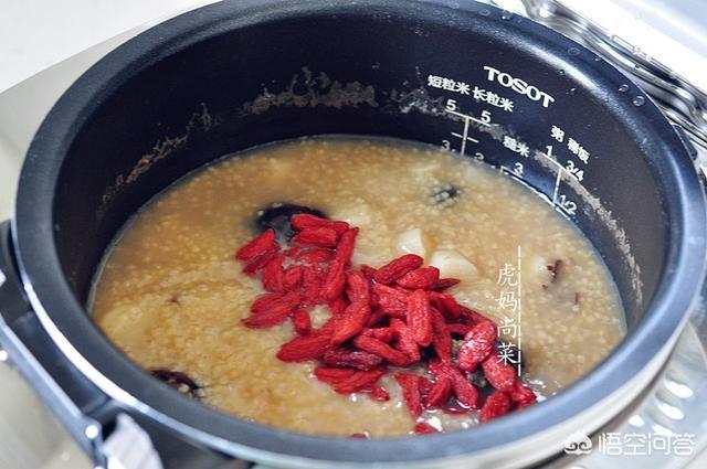 3) La première nuit pour réserver, le lendemain matin tôt, le porridge de millet est cuit, puis les baies de goji sont mises dans le couvercle et mijotées pendant cinq minutes.