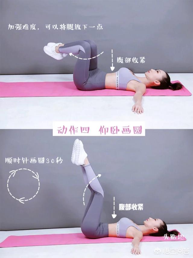 En haut, peinture dans le sens des aiguilles d'une montre, jardin pendant 30 secondes, resserrement abdominal pendant 30 secondes.