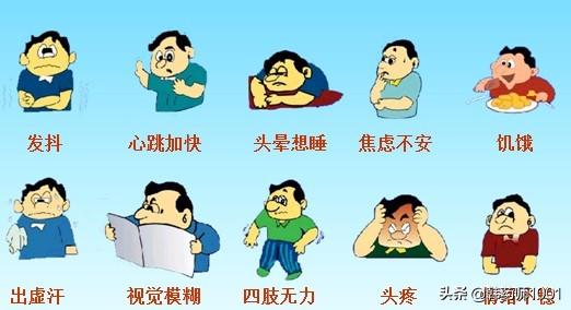 Troisièmement, les patients diabétiques dont la fonction des îlots pancréatiques est altérée ont non seulement une capacité réduite à sécréter de l'insuline, mais aussi une capacité affaiblie à sécréter du glucagon, de sorte que les patients diabétiques sont plus enclins à l'hypoglycémie lorsqu'ils ne se réapprovisionnent pas en glucides en temps voulu. En cas d'hypoglycémie, on peut observer une transpiration abondante (environ 1/2, la sueur froide étant plus fréquente), des tremblements (environ 1/3), une vision floue, de la faim, de la faiblesse (environ 1/4-1/3), ainsi que de la nervosité, de la pâleur, des palpitations, des nausées et des vomissements, et une froideur des extrémités.