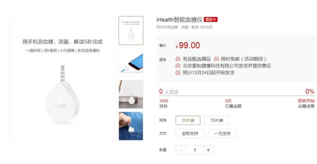 Le précédent crowdfunding en ligne de Xiaomi, un glucomètre intelligent iHealth, dont le prix est de 99 yuans (25 comprimés), peut être mesuré par le biais de la glycémie du téléphone portable, et le processus de mesure et d'interprétation peut être complété en seulement 5 secondes, l'opération est très pratique, plus adaptée pour les personnes âgées à la maison.