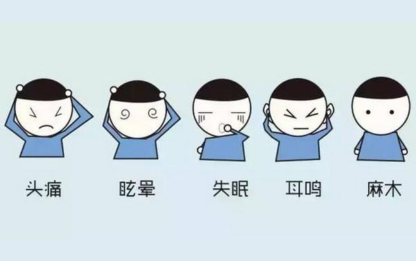Les symptômes de l'hypertension artérielle sont généralement des maux de tête, des vertiges, une vision floue, des bourdonnements d'oreille, des palpitations et de l'insomnie, ces symptômes s'accentuant au fur et à mesure que des complications surviennent dans les organes endommagés. Les maux de tête, les vertiges et les étourdissements sont des symptômes neurologiques courants de l'hypertension, et l'on observe parfois une lourdeur de la tête, une tension de la plaque cervicale et une raideur.
