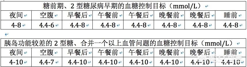 Objectifs de contrôle glycémique pour les diabétiques :Glycémie à jeun ≤ 6,1 mmol/L ; glycémie postprandiale ≤ 7,8 mmol/L ; hémoglobine glyquée ≤ 6,5 %.