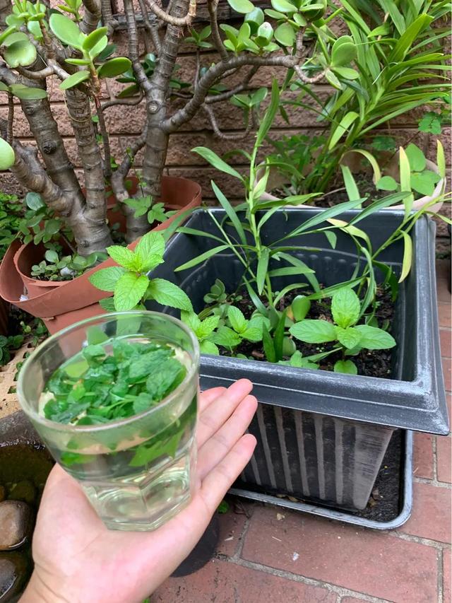 J'ai également un pot de menthe qui pousse dans mon jardin, et de temps en temps, je cueille quelques brins de feuilles de menthe pour préparer une tasse de thé à la menthe... magnifique ! Magnifique !