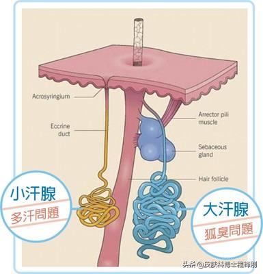 Les glandes sudoripares du corps humain se divisent en deux catégories : l'une est une petite glande sudoripare, répartie sur l'ensemble du corps, la transpiration est peu abondante et n'a généralement pas de goût ; l'autre est la glande sudoripare à sécrétion supérieure, concentrée dans les aisselles, l'entrejambe, l'aréole et d'autres parties de la sueur, qui contient une variété de protéines et d'acides gras, cette sécrétion par les bactéries à la surface de la décomposition du corps, la génération d'acides gras insaturés, ce qui donne une mauvaise odeur de renard.