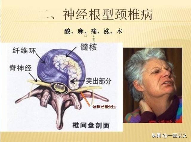 Les personnes plus âgées considèrent que la première est une hernie discale cervicale qui comprime le nerf, également appelée spondylose cervicale de type racine nerveuse. Le second est un ostéophyte cervical qui comprime les nerfs. Ces deux types d'ostéophytes sont généralement plus lourds et ont un cycle de récupération plus long.