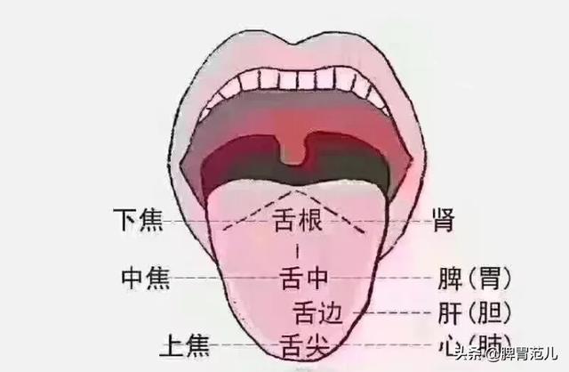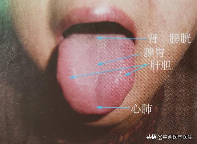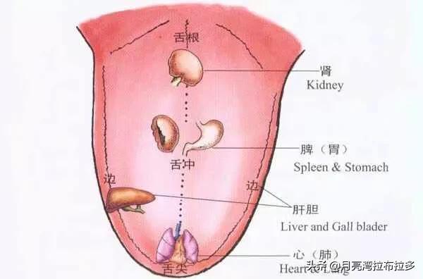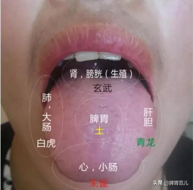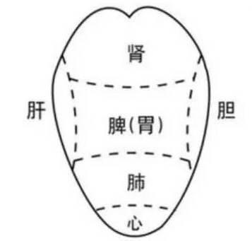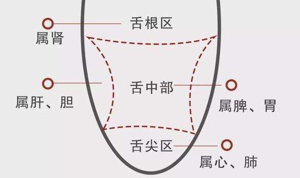 Les deux côtés de la langue correspondent au foie et à la vésicule biliaire, le bout de la langue au cœur, la partie antérieure de la langue aux poumons, le milieu de la langue à la rate et à l'estomac, et la racine de la langue aux reins. Des anomalies dans différentes zones de la langue correspondent à des anomalies dans différentes parties du corps. Par exemple, si le bout de la langue est rouge et rouge avec des épines de fauve, il y a un feu au cœur.