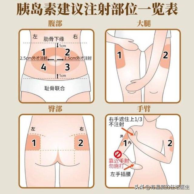 L'insuline est utiliséeinjection hypodermiqueAinsi, l'injection dans la couche musculaire doit être évitée. En fonction de la distribution des nerfs vasculaires et des tissus sous-cutanés dans le corps humain, les injections d'insuline sont souvent choisies dans les quatre sites suivants :Abdomen, tiers moyen de la face latérale du bras, tiers supérieur de la face antéro-latérale des cuisses bilatéralement, et face latérale supérieure des fesses bilatéralement.。