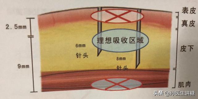 La structure de la peau est composée de peau, de graisse et de muscle de l'extérieur vers l'intérieur, et l'insuline doit être injectée dans le tissu adipeux. Si l'injection est trop profonde, le muscle l'absorbera et le temps d'action sera réduit ; si elle est trop superficielle, l'absorption sera lente, ce qui affectera l'action de l'insuline. Par conséquent, les personnes minces ou les enfants doivent être injectés à 45°, et les personnes grasses à 90°. C'est également la raison pour laquelle il faut choisir la zone ci-dessus, où la couche de graisse est plus épaisse et où il est plus facile de trouver la bonne profondeur d'injection.