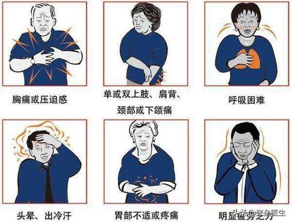 ① Oppression thoracique et douleur thoracique qui, au début, peut se limiter à une sensation d'oppression thoracique et d'essoufflement après une activité, comme si un bloc de pierre appuyait sur la poitrine. Dans les cas graves, la douleur thoracique est récurrente, surtout après des activités professionnelles ou des fluctuations émotionnelles, avec une douleur dans la région rétrosternale ou précordiale, des épisodes intermittents d'une durée de 3 à 5 minutes, soulagés par le repos. Si la douleur est persistante et sévère, accompagnée de sueurs abondantes et d'irritabilité, il faut immédiatement consulter un médecin, ce qui peut être le symptôme d'une crise cardiaque, en plus des symptômes de douleur atypiques tels que le mal de dents, la douleur dans l'épaule gauche et le bras gauche, le mal de gorge, le mal de dos, la douleur abdominale, etc.