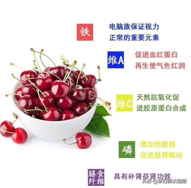 Les cerises sont sucrées, croquantes, juteuses et nutritives. Bien que les cerises puissent augmenter le taux de sucre dans le sang, elles ont un faible indice glycémique et contiennent de nombreux composants bénéfiques pour la santé, ce qui en fait un fruit approprié pour les amis qui souffrent d'hyperglycémie, d'hypertension artérielle, d'acide urique élevé et de perte de poids.