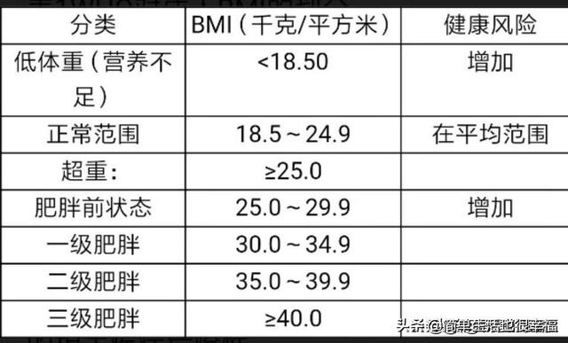 L'Organisation mondiale de la santé (OMS) définit l'IMC comme étant de 22 pour les hommes et de 19 pour les femmes, la fourchette normale de l'IMC étant de 20 à 25 pour les hommes et de 18 à 23 pour les femmes, la limite inférieure étant considérée comme mince et la limite supérieure comme grosse. Par ailleurs, l'OMS définit le surpoids et l'obésité chez l'adulte comme suit : le surpoids lorsque l'IMC est égal ou supérieur à 25, et l'obésité lorsque l'IMC est égal ou supérieur à 30. Notre pays divise la fourchette de valeurs de l'IMC en fonction des caractéristiques physiques de la population : un IMC inférieur à 18,5 correspond à une insuffisance pondérale, un IMC compris entre 18,5 et 23,9 est normal, un IMC compris entre 24 et 27,9 correspond à une surcharge pondérale, et un IMC supérieur ou égal à 28 correspond à l'obésité.