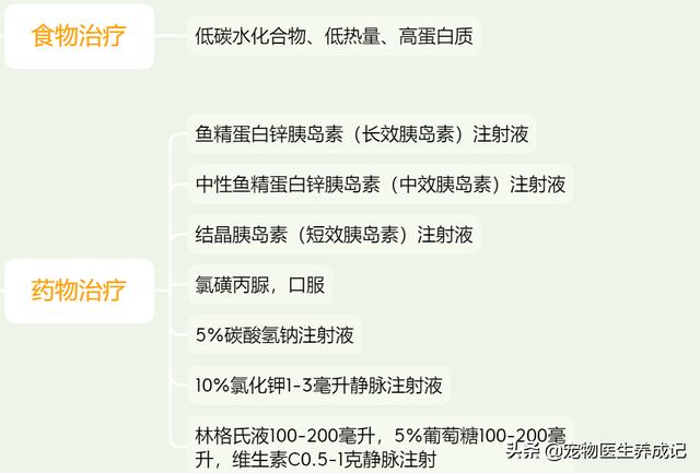 - Injection d'insuline (insuline à action intermédiaire) à base de zinc et de fisétine neutre : 0,5-1 unité/kg de poids corporel chez les chiens, 3-5 unités/dose chez les chats, injection sous-cutanée, 1x/jour, pour abaisser la glycémie.
