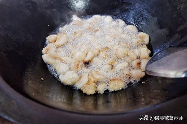 3. Continuer à faire sauter et utiliser une spatule pour presser le saindoux, de plus en plus d'huile dans la poêle, le saindoux devient de plus en plus petit et forme un résidu d'huile brun doré.