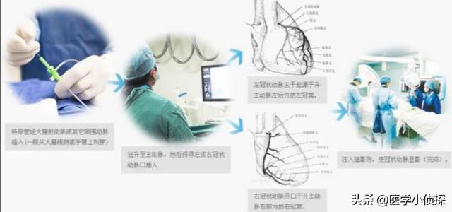Il existe des angiographies coronaires et des angiographies cardiaques (auriculaires et ventriculaires). La coronarographie consiste à utiliser un cathéter fin comme un cheveu le long de l'artère radiale (au niveau du poignet) ou de l'artère fémorale (au niveau de la cuisse) pour prolonger l'entrée artificielle jusqu'à l'ouverture de l'artère coronaire du cœur, puis à injecter l'agent de contraste (dans les rayons X) dans les artères coronaires, afin de montrer la morphologie interne des artères coronaires, par exemple pour vérifier l'absence de rétrécissement des artères coronaires, de plaque, etc. L'objectif principal est de comprendre la forme interne des artères coronaires et la vitesse du flux sanguin dans les artères coronaires.