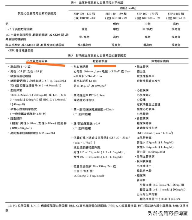 La nécessité d'une médication dépend du sexe, de l'âge, des antécédents de tabagisme, de la glycémie, des lipides sanguins, des antécédents familiaux de maladies cardiovasculaires précoces, de l'obésité, des taux d'homocystéine et de la présence ou non d'une hypertrophie ventriculaire gauche, d'une sténose de l'artère carotide, de lésions rénales et d'autres lésions d'organes cibles à évaluer ; par conséquent, plus la tension artérielle est élevée, plus le risque de développer une maladie cardiovasculaire est important. Par conséquent, plus la pression artérielle est élevée, plus le risque de maladie cardiovasculaire est important. Toutefois, une pression artérielle légèrement plus élevée n'est pas un motif de complaisance. Les patients présentant une combinaison des facteurs de risque susmentionnés et des lésions des organes cibles peuvent présenter un risque élevé, voire très élevé, de maladie cardiovasculaire et doivent commencer immédiatement un traitement antihypertenseur sur la base d'une amélioration de leur mode de vie.