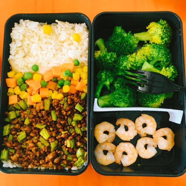 Déjeuner : Riz à grains mélangés (20g de riz, 80g de riz de sorgho), champignons et légumes verts (300g de légumes verts, 20g de champignons), nuggets de poulet épicés (120g de nuggets de poulet).