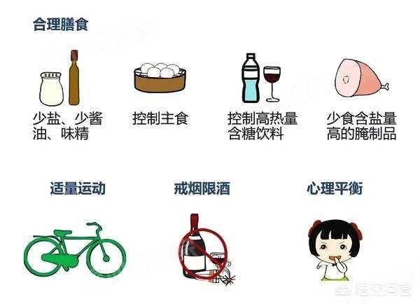 ① Contrôler strictement les aliments riches en sucre (glucides) ; ② Adopter un régime pauvre en sel et en graisses ; ③ S'abstenir de boire de l'alcool ; ④ S'abstenir de fumer ; ⑤ Augmenter la quantité d'exercice physique ; ⑥ Manger plus de légumes, en excluant les aliments riches en amidon tels que les pommes de terre, les ignames et les racines de lotus ; ⑦ Consommer une quantité modérée de protéines, par exemple 2 taels de viande maigre, 1 tasse de lait et 1 œuf par jour.
