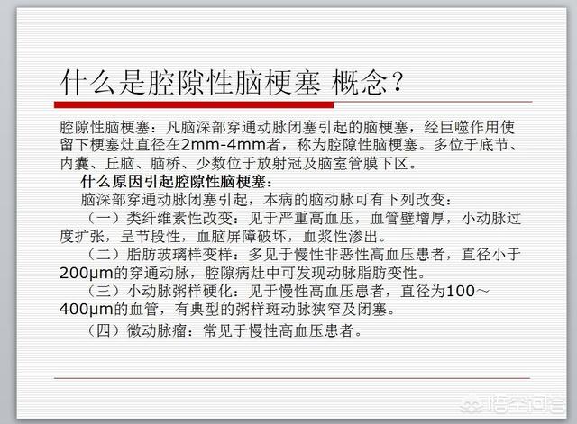 En ce qui concerne la base pathologique, la base pathologique de l'infarctus cérébral commun est l'athérosclérose, bien sûr, il y a quelques infarctus cérébraux causés par la fibrillation auriculaire. La base pathologique de l'infarctus cérébral lacunaire est la dégénérescence, le gonflement et le durcissement des petites parois artérielles provoqués par une hypertension artérielle de longue durée qui n'est pas contrôlée efficacement, au point que l'occlusion finit par se produire.