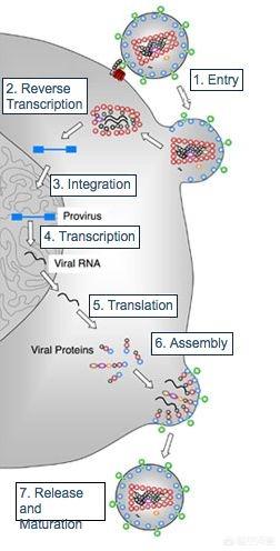 1) le virus VIH pénètre dans la cellule par l'intermédiaire de molécules adsorbées à la surface de la cellule CD4 ; 2) le processus de transcription inverse commence, et c'est alors que la transcriptase inverse portée par le VIH lui-même entre en jeu ; 3) l'ADN synthétisé par la transcription inverse est intégré dans le génome de la cellule hôte ; 4) le processus de transcription commence à synthétiser de nouveaux ARNm ; 5) la transcription des ARNm synthétise de nouvelles protéines virales ; les protéases doivent être impliquées ; 6) l'assemblage de nouvelles particules virales ; 7) la libération des protéines et des particules nouvellement assemblées en vue de la maturation ; 8) la libération des protéines et des particules nouvellement assemblées en vue de la maturation. Assemblage de nouvelles particules virales ; 7) Libération des protéines et des particules nouvellement assemblées en vue de leur maturation.