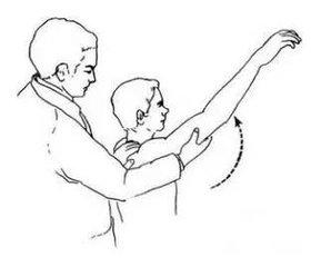 Lorsque la rotation externe est limitée, le bras du membre supérieur atteint est placé près de la position thoracique et la main saine est utilisée pour aider le bras atteint à effectuer des mouvements de rotation vers l'extérieur afin d'augmenter l'amplitude du mouvement de rotation externe de l'articulation de l'épaule.