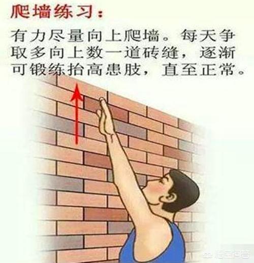 L'escalade du mur des doigts devrait être l'exercice le plus classique pour améliorer l'amplitude de mouvement des articulations. Le patient se tient face au mur / côté au mur, avec le côté affecté du doigt le long du mur, grimpant lentement vers le haut, de sorte que le membre supérieur soit aussi haut que possible, jusqu'à la limite maximale, dans le mur pour une marque, puis redescend lentement à l'endroit initial, répété, augmentant graduellement la hauteur.