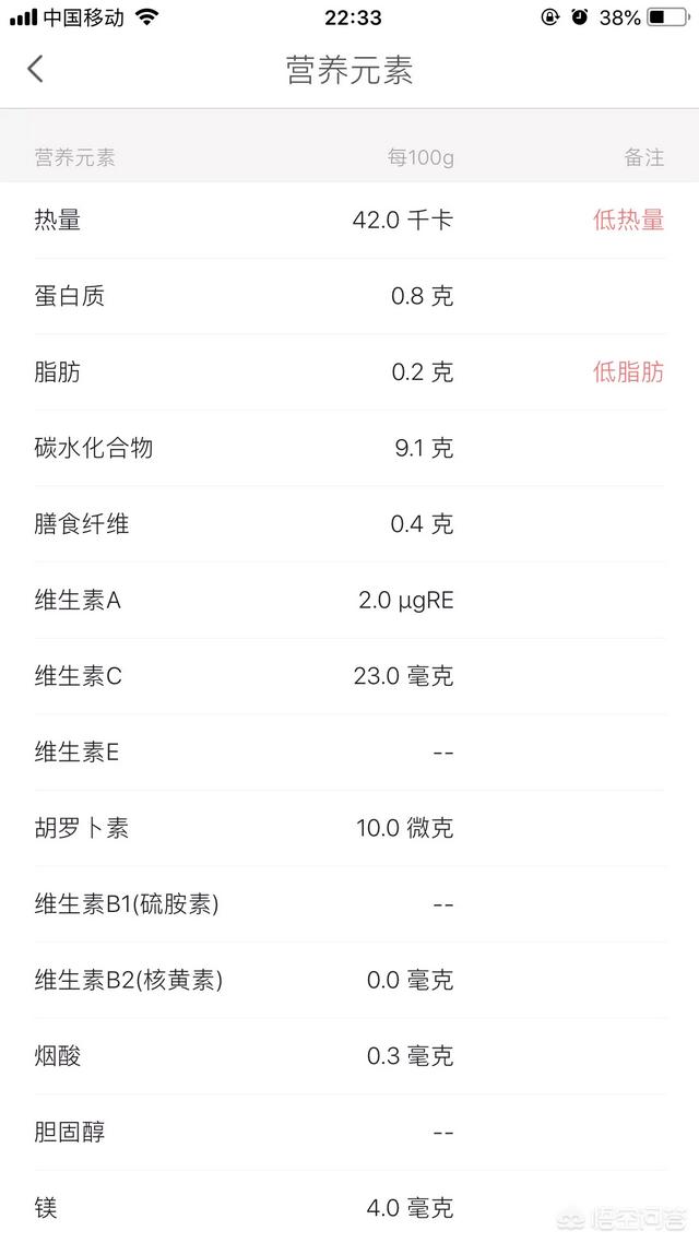 Énergie 41kcal, protéines 0,8g, graisses 0,2g, glucides 9,5g, fibres insolubles 0,4g, vitamine C 23mg, phosphore 24mg, potassium 119mg, sodium 3mg, magnésium 4mg, fer 0,3mg, etc., en plus du chrome, de la naringénine, de la niacine, de la pectine, etc.