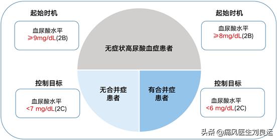 La clé du traitement des patients goutteux est de contrôler le taux d'acide urique dans le sang et de favoriser la dissolution et l'élimination des cristaux d'urate formés. Par conséquent, les patients atteints de goutte doivent utiliser des médicaments abaissant le taux d'acide urique, en fonction de leur état, ils peuvent être utilisés pour inhiber la production d'acide urique (allopurinol, febuxostat) ou pour favoriser l'élimination de l'acide urique (benzbromarone). Il est recommandé de contrôler le taux d'acide urique dans le sang à 360umol / L ou moins, comme la formation de calculs de goutte ou l'arthrite goutteuse chronique fréquente, les auteurs doivent être contrôlés à 300umol / L ou moins, afin de maximiser la promotion de la dissolution et de l'élimination des cristaux de sel d'acide urique. Les auteurs de l'étude ont également souligné la nécessité de réduire au minimum la récurrence de la goutte.