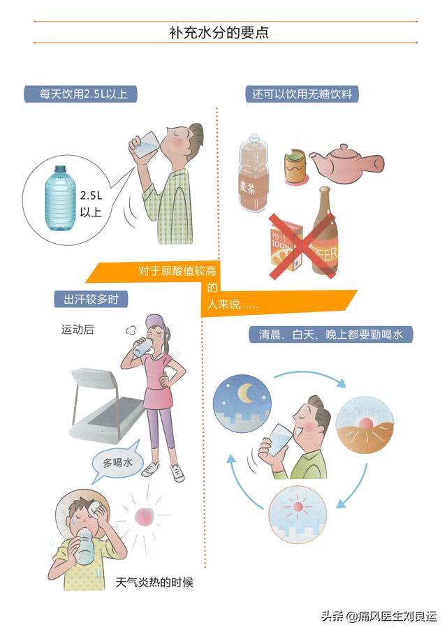 - (7) Hydratez-vous abondamment :En l'absence d'insuffisance rénale, il est conseillé de boire davantage d'eau, principalement de l'eau plate ou du thé léger chaque jour, et de maintenir l'apport hydrique à environ 2500~3000 ml, et la production quotidienne d'urine à environ 2000 ml, afin de permettre à l'acide urique d'être excrété en douceur dans l'urine.
