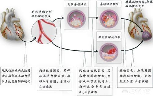 L'infarctus du myocarde est causé par une obstruction aiguë et persistante des artères coronaires qui alimentent le cœur en sang, entraînant une ischémie et une hypoxie du myocarde et, finalement, une nécrose ischémique dans la zone irriguée par les vaisseaux sanguins. Les causes courantes de l'infarctus du myocarde sont les suivantesLes principaux groupes à risque sont①hypertendu(i) La population, en particulier celle qui souffre d'un mauvais contrôle chronique ; (ii) La population, en particulier celle qui souffre d'un mauvais contrôle chronique ; (iii) La population, en particulier celle qui souffre d'un mauvais contrôle chronique.Lésions sous-jacentes des artères coronaires: ils présentent souvent une sténose sous-jacente de l'artère coronaire et sont sujets à une obstruction aiguë ; (iii)Hyperlipidémie, obésitéles patients ont une probabilité accrue d'infarctus du myocarde ; ④le diabète: également susceptible de souffrir d'un infarctus du myocarde ; ⑤Tabagisme et consommation incontrôlée d'alcoolLe tabagisme et la consommation excessive d'alcool sont fortement associés à l'infarctus du myocarde ; vi.Mauvaise alimentationLa maladie est plus susceptible de survenir chez les personnes qui ont suivi un régime alimentaire riche en graisses animales, en cholestérol, en sucre et en sel pendant une longue période ; (7)Nervosité et stress chroniques: ces populations sont également fortement associées à l'infarctus du myocarde ; ⑧le manque d'exerciceLe manque d'exercice est également un facteur de risque élevé.